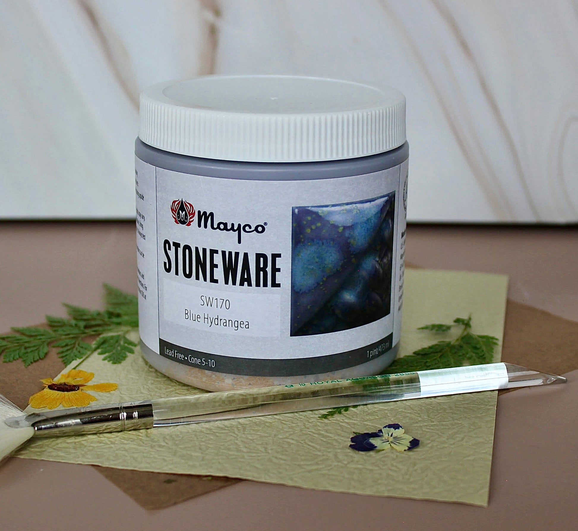 Blue Hydrangea (Mayco SW‑170) is a beautiful stoneware crystal glaze that blooms with pale yellow and white crystalline bursts over a glossy blue base. In cone 6 oxidation, expect rich floral-like blooms, while cone 10 shifts to deeper blues with subtler crystal effects. Crystal movement is best showcased on layered or vertical surfaces, providing unique, painterly finishes.