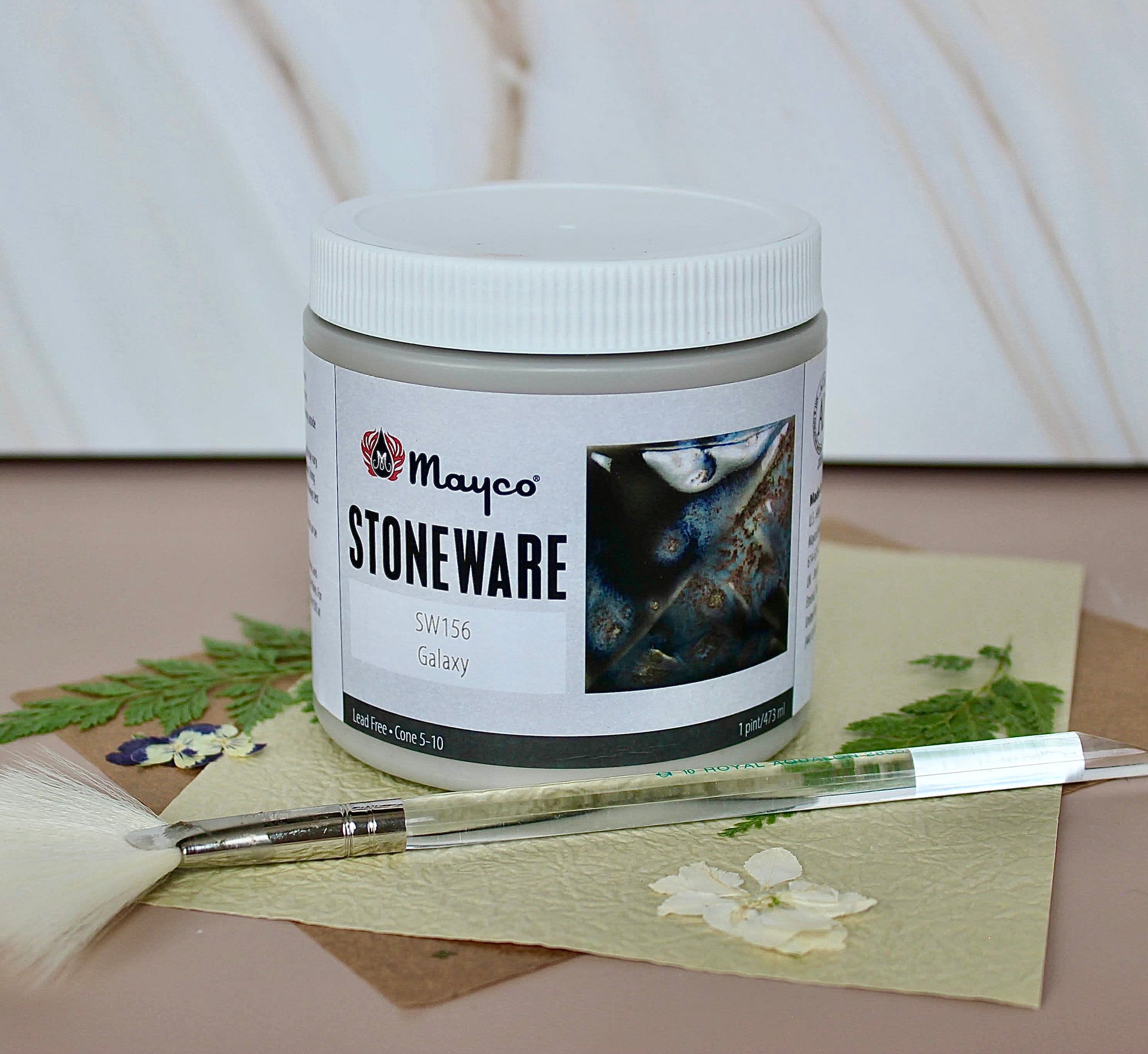 Galaxy (Mayco SW‑193) is a deep charcoal-gray crystal glaze accented with sparkling silver and gold crystals that scatter across the surface like stars. In cone 5/6 oxidation, the glaze pools into dramatic dark hues, while cone 10 reduction warms the base and refines crystal structure. Ideal for textured and layered applications. Galaxy delivers cosmic depth and metallic shimmer to each piece.