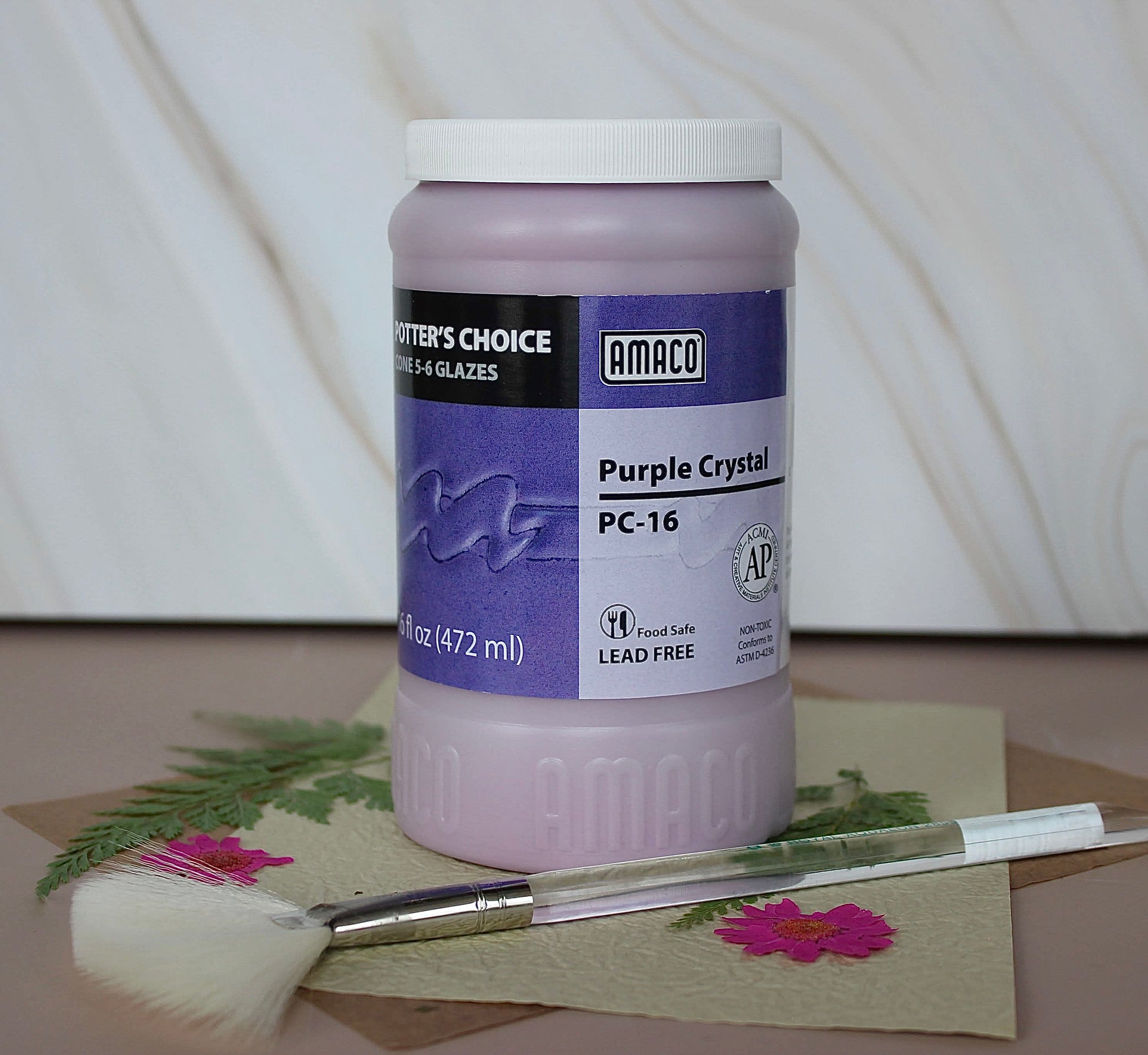 Purple Crystal (Amaco PC‑16) is a show-stopping glaze that blends deep violet tones with floating bursts of blue and white crystals. On vertical surfaces, the glaze cascades with movement, allowing the crystals to melt and settle in beautiful, one-of-a-kind patterns. Best on textured pieces or vertical forms where the crystal effects can shine.