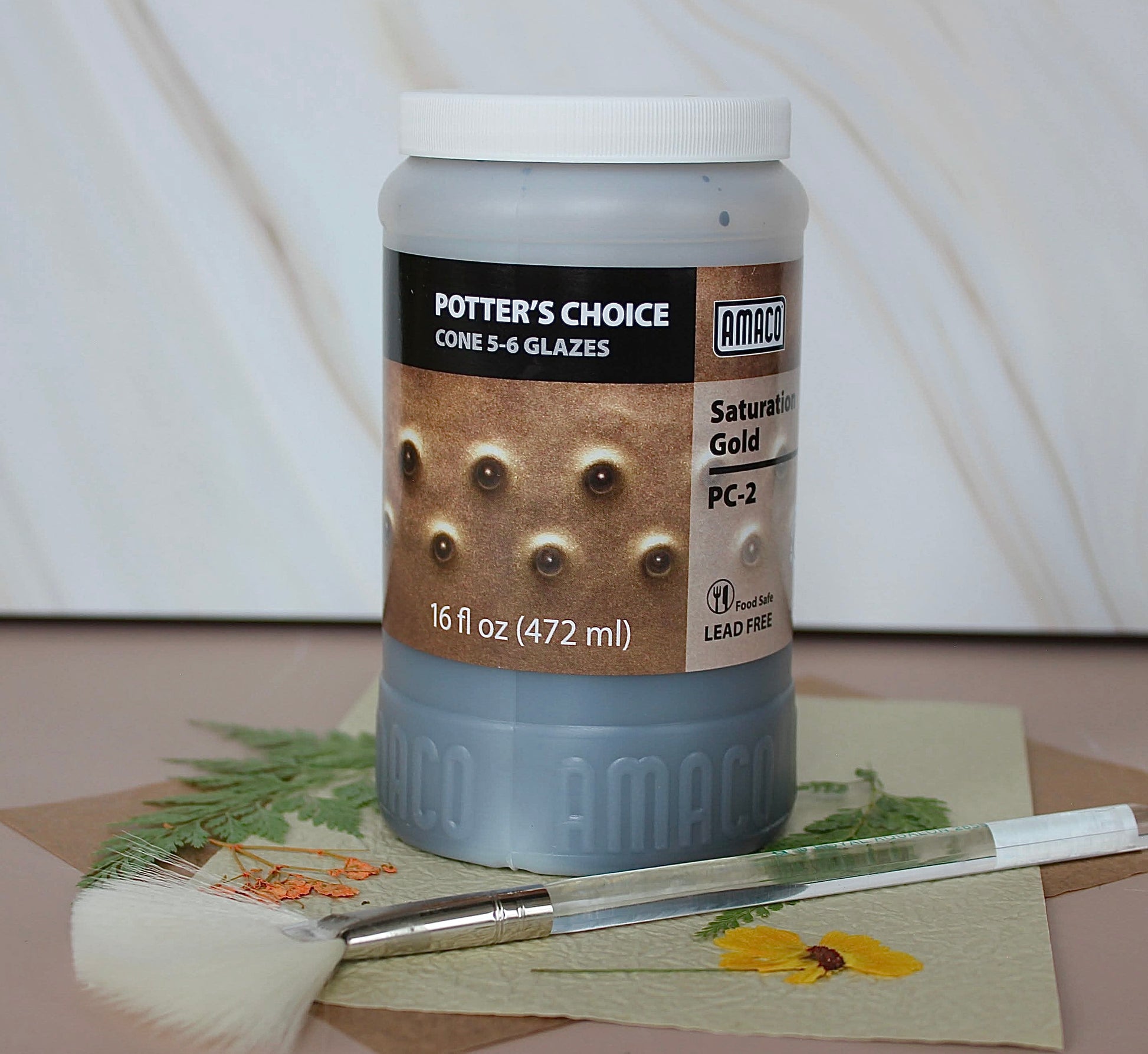 Saturation Gold (Amaco PC‑2) is a bold, metallic glaze with rich golden tones and subtle variegation. It has a semi-matte finish that ranges from soft ochre to shimmering brass, depending on application and firing. On textured or layered surfaces, it deepens and breaks with a quiet, understated sheen. Gorgeous alone or layered for complex metallic effects.